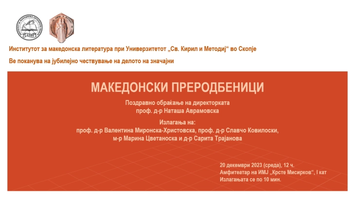 Во амфитеатарот на Институт за македонска литература ИМЈ „Крсте Мисирков“ во Скопје денеска ќе се одржи јубилејно чествување на делата на значајни македонски преродбеници.