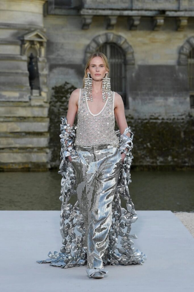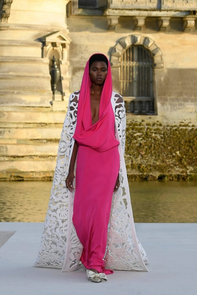 Прекрасното шоу на Валентино се одржа во славниот Шато де Шантили, северно од Париз. Елегантните силуети беа во контраст со раскошните украси: пердуви, скапоцени камења, смели цветови и сјај.