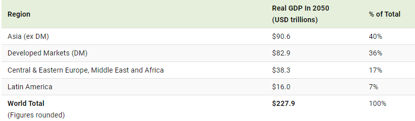 Следната табела вклучува регионален преглед на очекуваниот реален БДП во 2050 година.