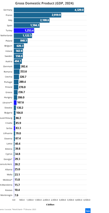 Десетте земји кои се стремат да се приклучат управуваат со 1,63 трилиони евра, а само Турција сочинува 1,25 трилиони евра од тоа. Ако се исклучи Турција, деветте преостанати земји-аспиранти заедно произведоа само 381 милијарда евра, помалку од 392 милијарди евра на Данска.