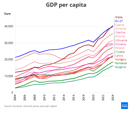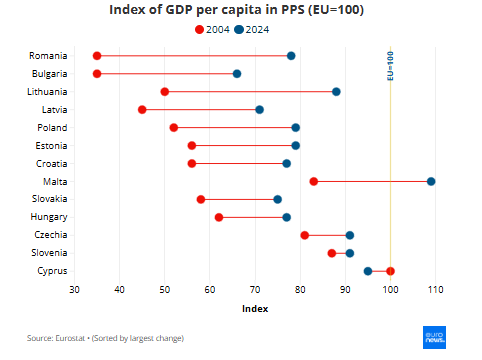Во текот на изминатите 20 години, од 2004 до 2024 година, додека БДП по глава на жител во ЕУ порасна за респектабилни 88%, при што индексот се искачи од 100 на 188 поени, растот во 13-те нови земји-членки позитивно се зголеми. Романија и Бугарија го забележаа најсилниот раст, од 558% и 500% соодветно, а индексот достигна 600 во обете земји.