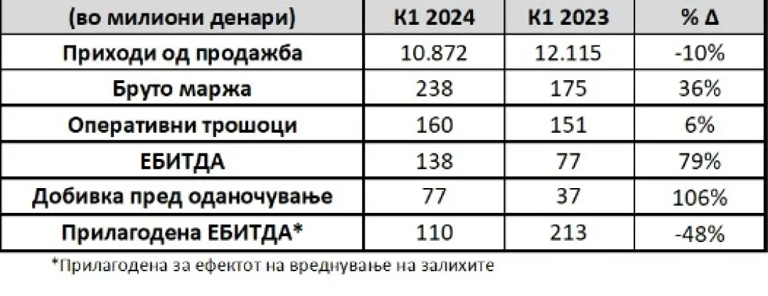 Бруто маржата достигна 238 милиони денари и забележа пораст од 36% споредено со истиот период минатата година. Добивката пред оданочување изнесува 77 милиони денари.