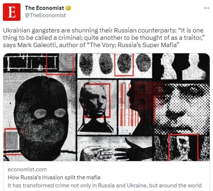 Руската инвазија го погоди овој подземен свет со сила на земјотрес. Огромното мнозинство “тешки“ украински мафијаши, престанаа да соработуваат со своите руски истомисленици: „Ние сме крадци, ние сме против секоја држава, но решивме дека сме за Украина“, вели еден од нив. Доходовните патишта за шверц на хероин се пресликуваат, што влијае на цените и профитот на криминалните синдикати илјадници милји подалеку. Ако прекинот се покаже траен, може да го смени лицето на глобалниот криминал. Тоа ќе ја промени и Украина.