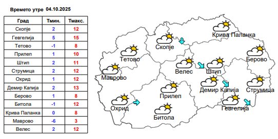 Утре времето ќе биде променливо облачно со сончеви периоди. Ќе дува слаб до умерен ветер од северен правец, поизразен долж Повардарието.