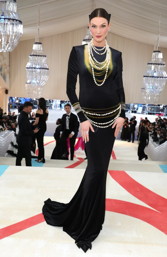 Клос синоќа се искачи на скалите на Музејот на уметност- Метрополитен во црн фустан до подот од Loewe, со долги ракави и жолт принт кој ја имитира сенката на нејзините ѓердани и ремени од бели бисери – од кои вториот го прегрна нејзиниот заоблен стомак Носеше и бели обетки од бисер и дијамант и дијамантски прстен.