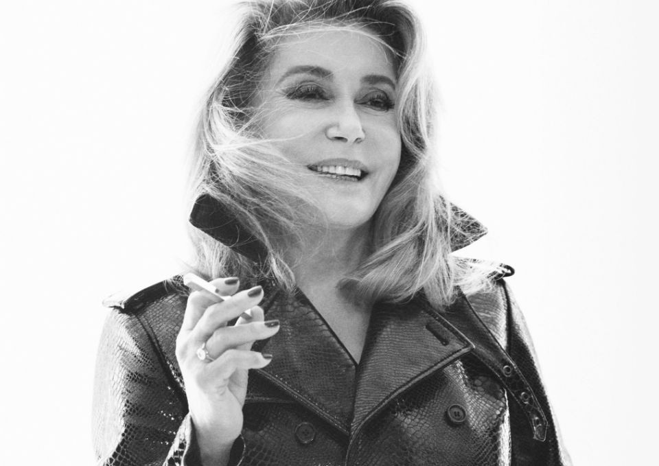 Француската актерка, која го олицетворираше стилот на Сен Лоран во филмот „“Belle de Jour,” од 1967 година, е прикажана на црно-белите фотографии облечена во мантил со кроко принт, стегната на половината со ремен, дизајниран од креативниот директор на Сен Лоран, Ентони Вакарело. На една фотографија, таа држи тенок метален предмет што се чини дека е електронска цигара.