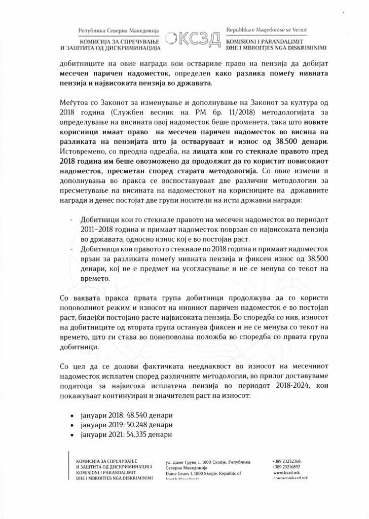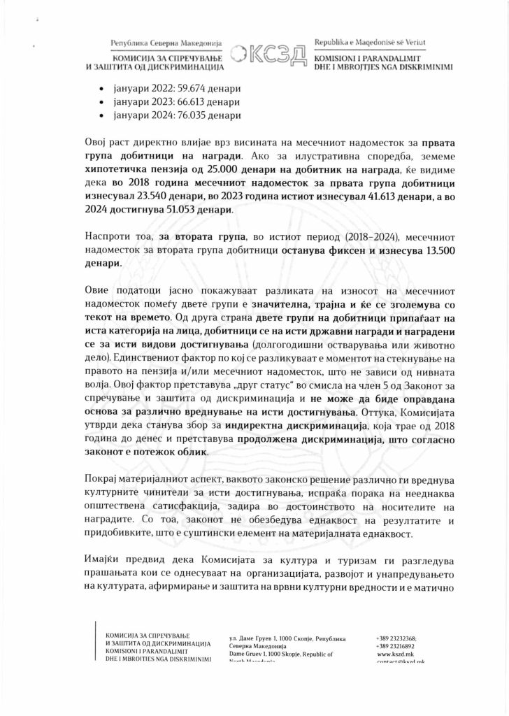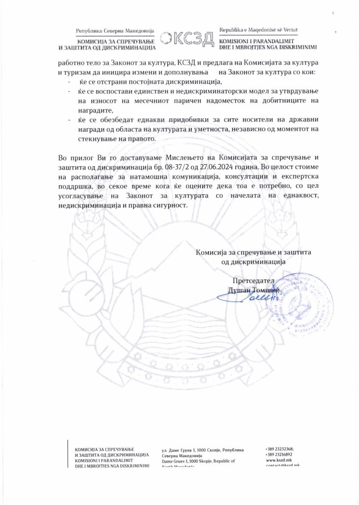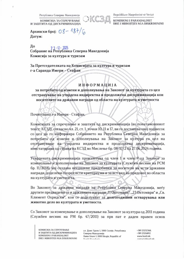 Комисијата за спречување и заштита од дискриминација до собраниската Комисија за култура и туризам поднесе информација за потребата од измени и дополнувања за Законот за култура, со цел, отстранување на утврдена индиректна и продолжена дискриминација кон носителите за државни награди од областа на културата и уметноста.