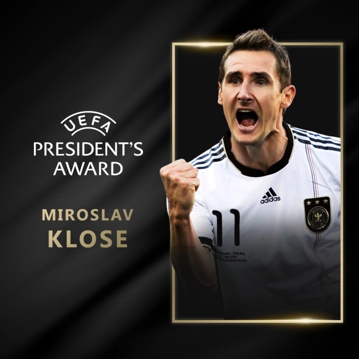 Легендарниот германски напаѓач Мирослав Клосе (45) е овогодишен добитник на Претседателската награда која УЕФА од 1998 година ја доделува на поранешни фудбалски великани.