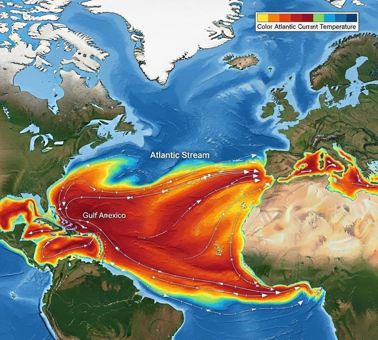 Станува збор за Атлантската меридијална циркулација на превртување, попозната под кратенката AMOC. Овој систем работи како џиновска океанска транспортна лента што влече топла вода од тропските предели и јужната хемисфера кон север. Таму, водата се лади, станува погуста, тоне на дното, а потоа се враќа на југ, одржувајќи ја климатската рамнотежа.