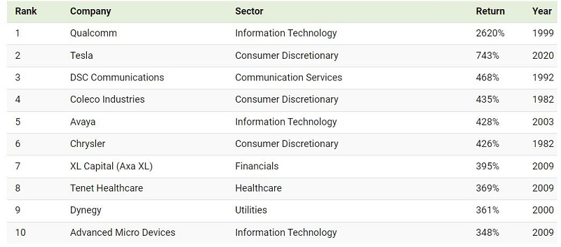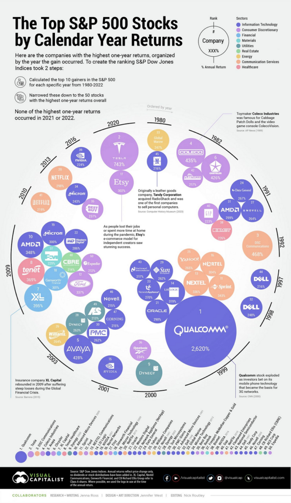 Во овој инфографик користејќи податоци од S&P Dow Jones Index, погледнете ги акциите на СиП 500 со најдобри едногодишни приноси во последните четири децении.