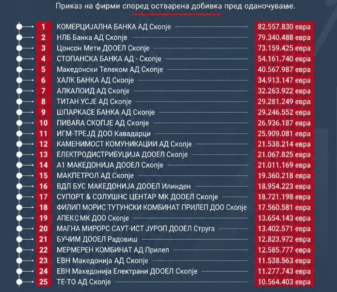 На врвот од листата на Топ-50 добивки доминираат банките, телеком операторите, друштва од фармацијата како „Алкалоид“ и „Мега витал“ (Зегин) , од електроенергетиката, трговијата со горива, но и од секторот за градежни материјали како „Усје Титан“, „ИГМ Трејд“, „Кнауф Радика“.