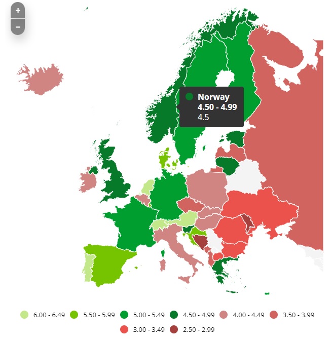 Може да наидете на неколку изненадувања притоа. Белгија (4,4) заостанува зад повеќето соседи во Западна Европа. Истото важи и за Италија (4,4), Ирска (4,4) и Исланд (4,1). На источната страна на Европа, Грција се издвојува со оценка 4,6, далеку од првото место, но посилна од соседите Бугарија (3,4), Северна Македонија (3,4) и Албанија (3,9). Друг позитивен резултат е Турција (5,0) која постигна подобри резултати од некои западни и нордиски земји, како Норвешка (4,5) и Обединетото Кралство (4,9).