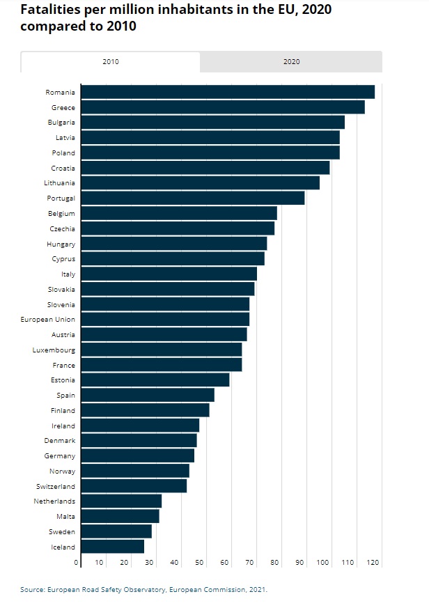 На глобално ниво во Европа, патиштата стануваат побезбедни. Ова може да се види со падот на бројот на сообраќајни несреќи што резултирале со повреди или смрт од 2010 до 2020 година. Земјите како Норвешка, на пример, го намалија бројот на фатални несреќи за 46 отсто во последната деценија. (Еуроњуз)