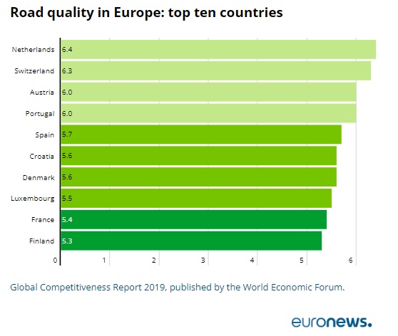 Во Европа, истражувањето откри дека западноевропејците имаат – или сметаат дека имаат – подобра патна инфраструктура на континентот. Источноевропејците, од друга страна, имаат севкупна мрачна слика за квалитетот на патиштата во нивните земји. Притоа, Холандија (6,4) го зазема првото место по квалитетот на патиштата во Европа – и е надмината само од Сингапур (6,5) на глобално ниво – по што следат Швајцарија (6,3) (која е исто така трета во светот), Австрија (6), Португалија (6), Шпанија ( 5,7) и Хрватска (5,6). На глобално ниво, четвртото и петтото место за подобар квалитет на патната инфраструктура им припадна на Хонг Конг (6,1) и Јапонија (6,1).