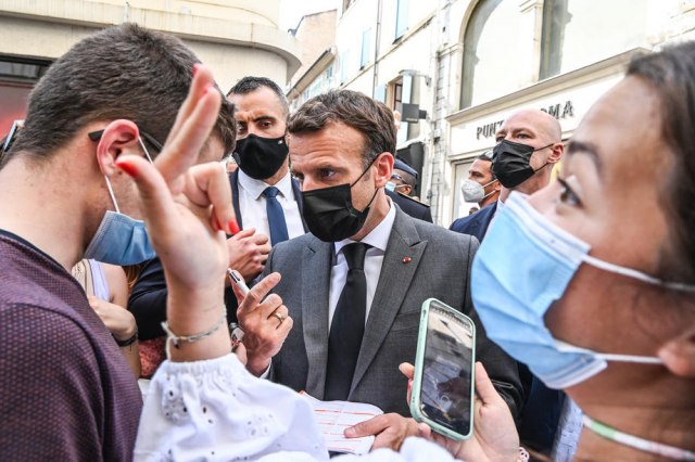 Макрон, кој се наоѓа на турнеја за да го почувствува „пулсот на земјата по пандемијата“, беше удрен во јужна Франција додека се поздравуваше со граѓаните.