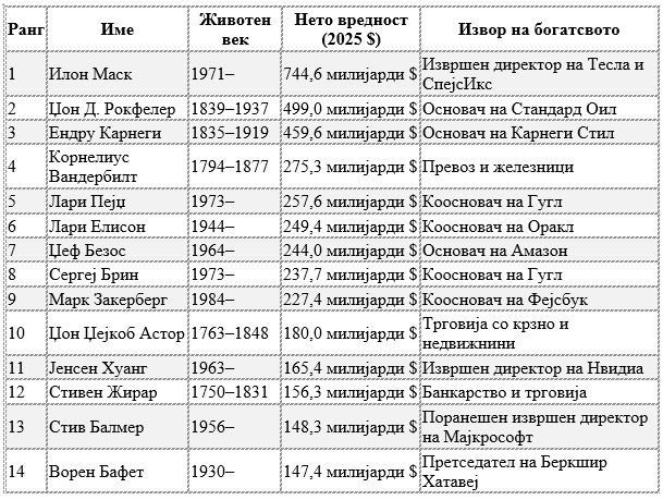 Врз основа на листата на Форбс на најбогатите луѓе во историјата од 2007 година, Business Insider го пресмета богатството на врвот на средствата и го прилагоди на доларите од 2025 година користејќи го калкулаторот за инфлација на Бирото за статистика на трудот на САД. Нето вредноста на живите лица ги одразува проценките на Форбс од 29 декември 2025 година.