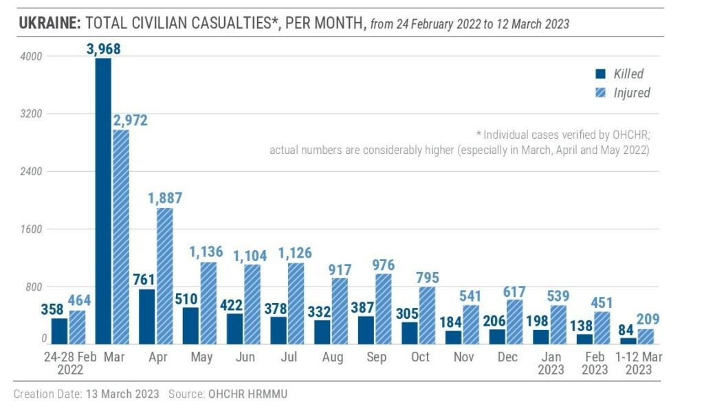 Според проценката составена од американска одбранбена разузнавачка агенција, Русија до април претрпела меѓу 189.500 до 223.000 жртви, вклучувајќи 35.500-43.000 убиени во акција и 154.000-180.000 ранети. Украина претрпела од 124.500 до 131.000 вкупни жртви, вклучувајќи 15.500-17.500 убиени во акција и 109.000-113.500 ранети во акција.