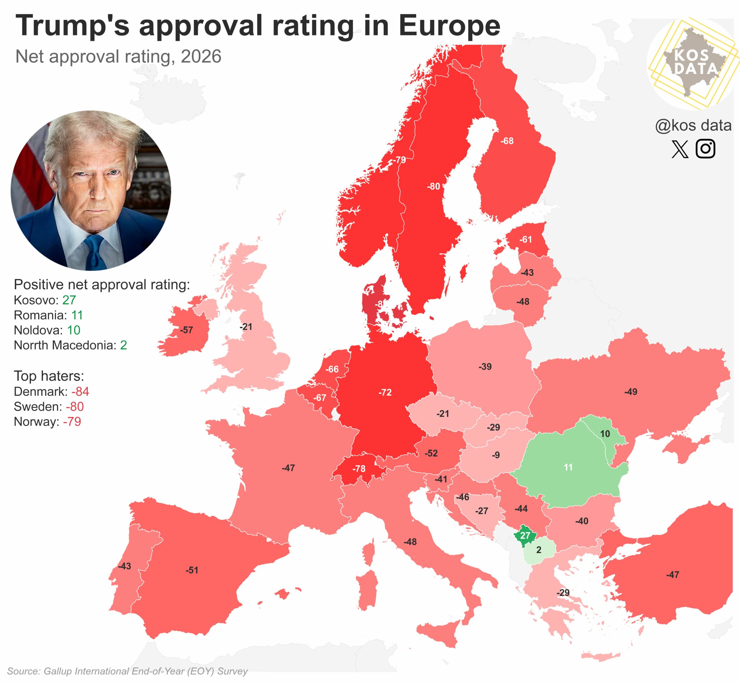 Гапуп интернешенел спровел анкета за популарноста на американскиот претседател во Европа која покажува дека најсилни поддржувачи тој има токму во нашиот регион, со Косово на врвот. Еве ги резултатите: