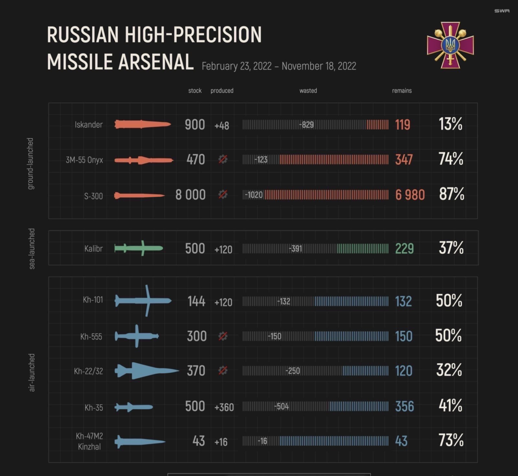 Најдеталното тврдење на Украина за ракетната ситуација на Русија е содржано во графиконот што го твитна министерот за одбрана Олекси Резников на 22 ноември, со кој се тврди дека ја покажува разликата во рускиот арсенал помеѓу 23 февруари, пред целосната инвазија, и 18 ноември.