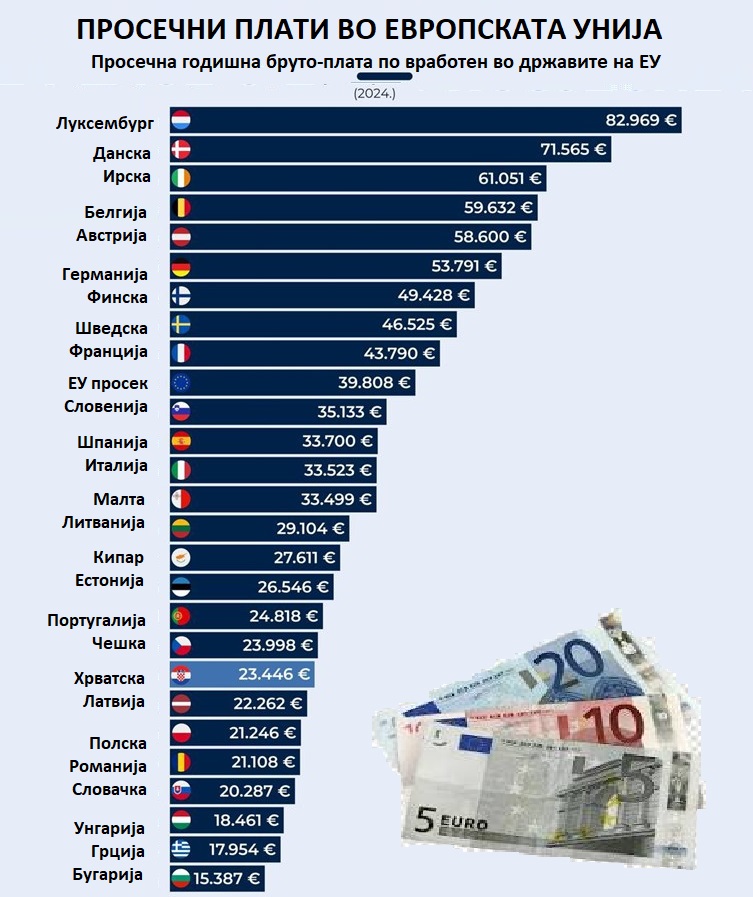 Покрај Луксембург, уште пет земји имаат просечни плати над 50.000 евра: Данска, Ирска, Белгија, Австрија и Германија. Хрватска, како што се очекуваше, е под просекот, со просечна плата од 23.446 евра. На дното на скалата, заедно со Бугарија, се Грција и Унгарија, каде што просечната годишна плата е помала од 20.000 евра.