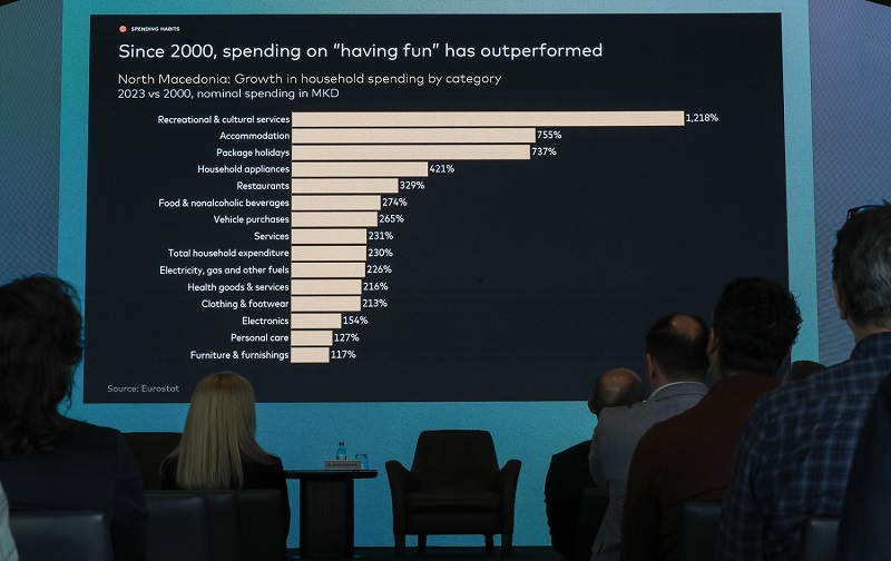 „Купoвната моќ на домаќинствата е зголемена за околу 83% од 2003 година досега, а потрошувачките навики се значително променети. Денешните потрошувачи сѐ почесто се насочуваат кон практични и алтернативни производи. Забележлив е трендот „искуство наместо материјално добро“, при што трошоците за забава се речиси двојно зголемени во однос на 2000 година. Македонија се вбројува меѓу земјите во регионот со највисока потрошувачка во ресторани, а потрошувачите сè повеќе даваат приоритет на убавина, уживање, вкусни задоволства и удобност“, истакна Манова.