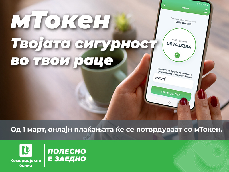 Од 1 март, интернет плаќањата со картичка ќе се потврдуваат со единствен безбедносен код генериран преку бесплатната апликација мТокен, наместо како досега со СМС код. Сите трансакции преку мБанка, пак, ќе се потврдуваат со ПИН или со биометриска автентикација, кои се користат и при најава на апликацијата.