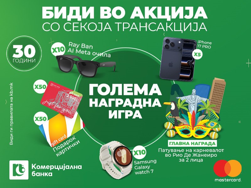 „Биди во акција со секоја трансакција“ со Mastercard од Комерцијална банка, извршена со картичка, телефон или смарт часовник и стани потенцијален добитник на вредни награди.