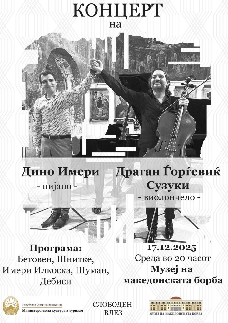 Во Музејот на македонската борба, вечерва со почеток во 20 часот, ќе се одржи концерт на двајцата истакнати уметници од регионалната и меѓународната сцена – виолончелистот Драган Ѓорѓевиќ Сузуки и пијанистот Дино Имери.
