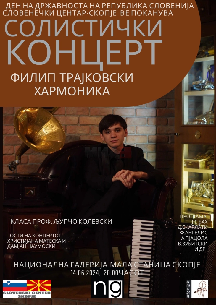 По повод Денот на државноста на Република Словенија во Национална Галерија – Мала станица вечер ќе одржи концерт хармоникашот Филип Трајковски.