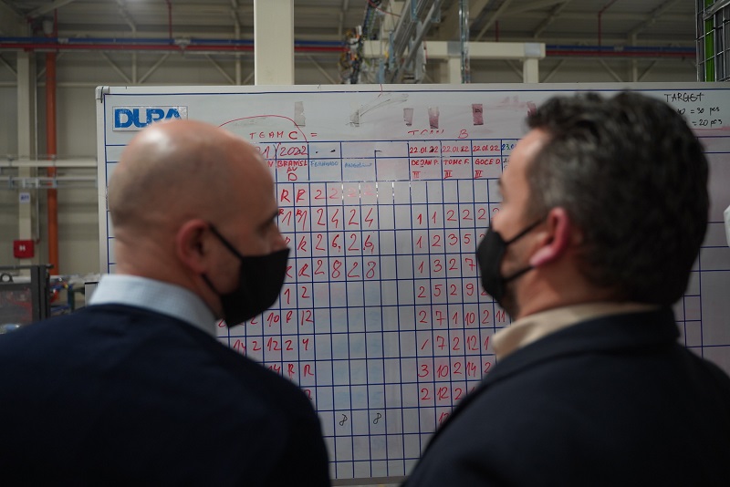 „Трудот на работниците мора соодветно да се вреднува и почитува. Овој закон има многу позитивен ефект врз економијата, тој ги стимулира работниците и позитивно влијае на нивната продуктивност што е во интерес и на самите компании. Законот недела неработен ден ќе даде одлични резултати во зголемување на продуктивноста на компаниите и унапредување на стопанството. Во оваа прилика би сакал да им честитам на раководството на „Дура“ кои покрај двете фабрики, планираат и нова трета инвестиција во фабрика, инвестиција од над 20 милиони евра. Висината на инвестицијата во двете фабрики каде има 680 вработени е речиси 70 милиони евра. Она што е важно е дека просечната нето-плата во оваа компанија е над 600 евра и има тенденција за натамошен раст, нагласи премиерот.