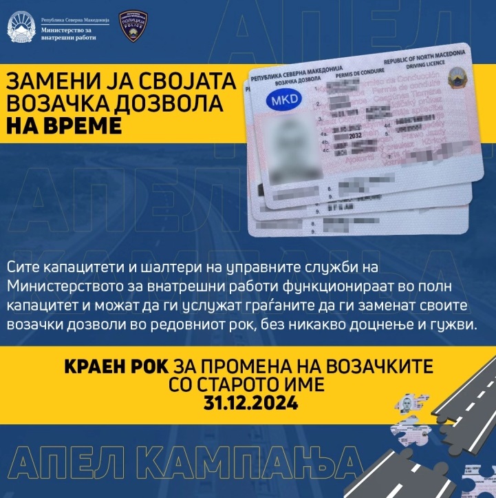 МВР денеска ги повика сите граѓани кои се уште имаат возачка дозвола со старото уставно име, да ја обноват својата возачка дозвола, до истекот на рокот, со цел да не се создаваат непотребни гужви.
