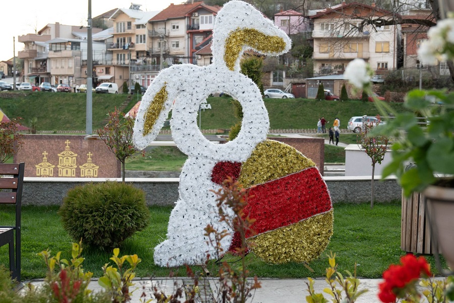 Градскиот плоштад и кејот на Крива Река се разубавени со раскошни цветни леи, внимателно аранжирани декорации и автентични велигденски реквизити.
