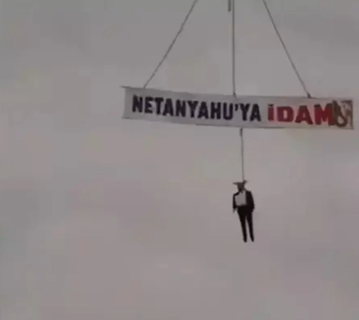 Фотографиите објавени од турскиот провладини весник „Јени Сафак“ покажуваат кукла како виси од кран во градот Трабзон на Црното Море. Над неа, на постер пишува „Смртна казна за Нетанјаху“.