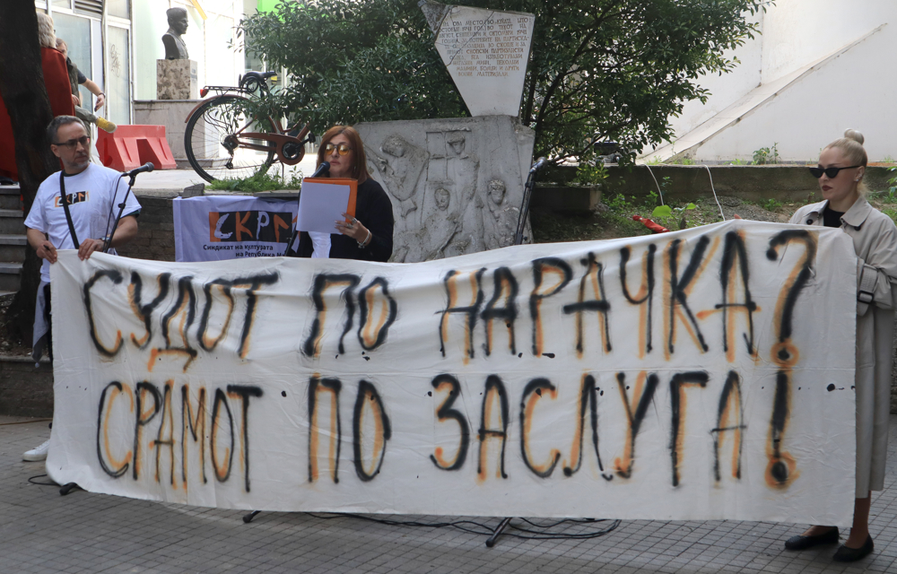 Културни работници денеска протестираа пред Уставниот суд, во организација на Синдикатот на културата (СКРМ). Културните работници стравуваат дека судската постапка во уставниот суд поврзана со Колективниот договор во културата може да доведе до уривање на веќе стекнатите работнички права.