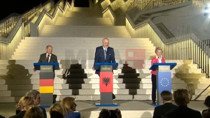 Претседателката на Европската комисија, Урсула Фон Дер Лајен и германскиот канцелар Олаф Шолц на заедничката прес-конференција со премиерот Еди Рама го осудија нападот во Бањска, Косово.