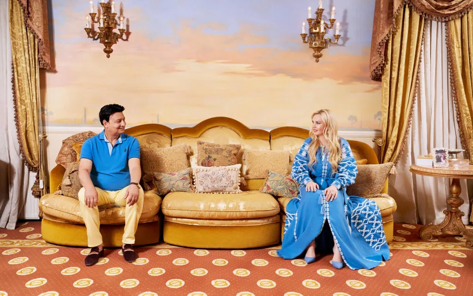 Пет месеци подоцна, стоиме во една од дневните соби на дворецот на Захурс во Хемпстед, северен Лондон, апсолутно опкружени со столици. Насекаде има столчиња. Златни столчиња со леопарди. Големи тркалезни кадифени столчиња. Мали софи, долги софи. Досега имам изброено и 56 перничиња само во оваа соба.