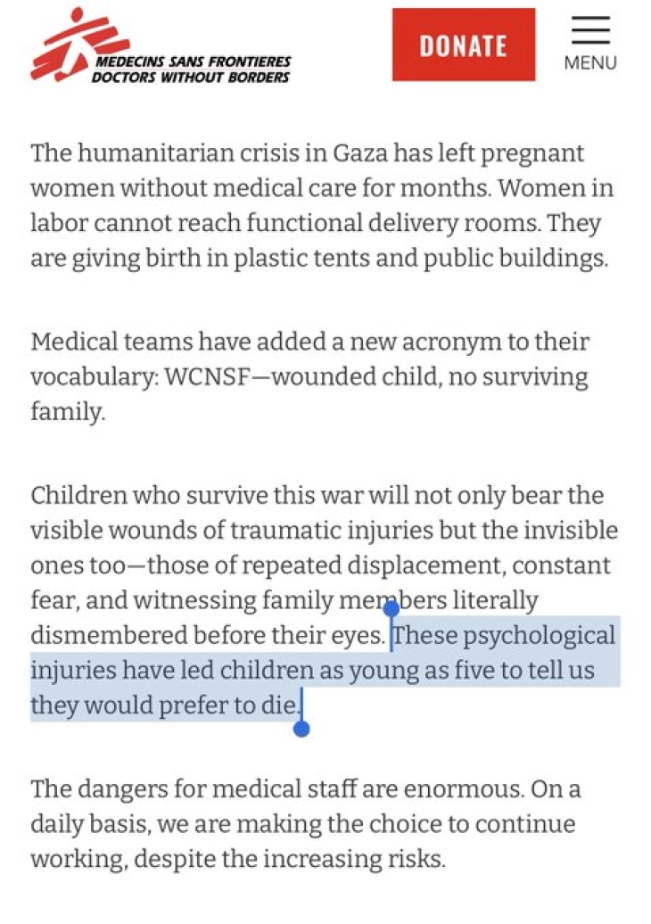 Генералниот секретар на меѓународната хуманитарна организација „Лекари без граници“, Кристофер Локјер пред Советот за безбедност на Обединетите нации рече дека медицинските тимови во Појасот Газа додале нова кратенка во нивниот вокабулар: WCNSF – Повредено дете, нема преживеани родители.