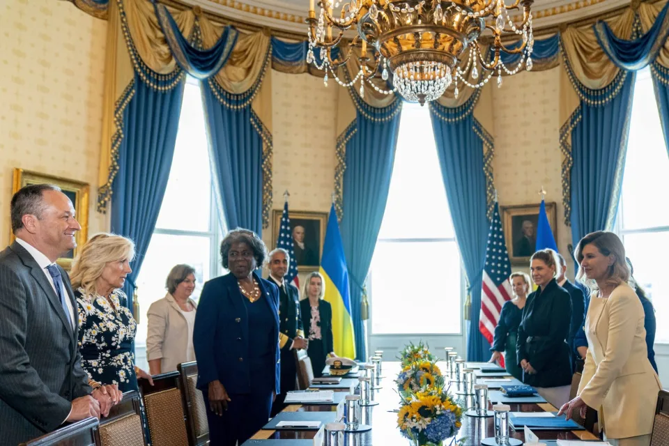 Првите дами зборуваа за „континуираната поддршка на Соединетите Држави за владата на Украина и нејзиниот народ додека ја бранат својата демократија и се справуваат со значајните човечки влијанија на руската војна, кои ќе се чувствуваат во годините што доаѓаат“.