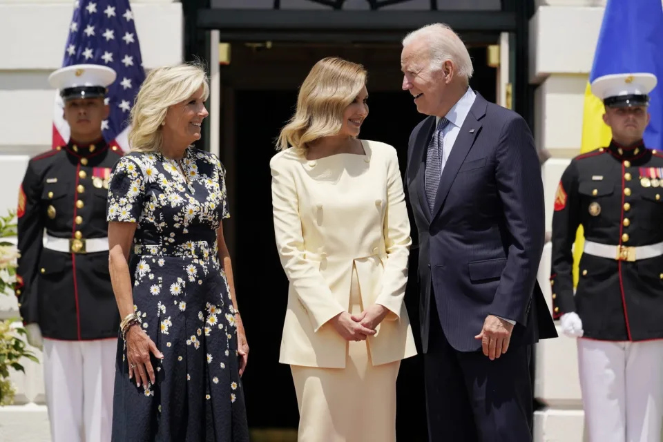 По пристигнувањето во попладневните часови, Зеленска (44) доби топло добредојде од д-р Бајден (71) и нејзиниот сопруг, претседателот Џо Бајден, кои ѝ врачија букет цвеќе на нивниот специјален гостин. Бајден и Зеленска се прегрнаа пред групата да се фотографира и заедно да влезе внатре.