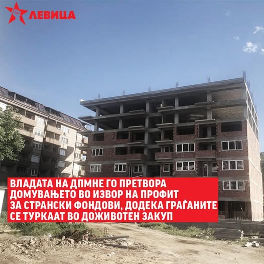 Државата има обврска да обезбеди услови во кои граѓаните ќе можат да стекнат сопствен дом, наместо да бидат претворени во извор на приход за странските инвестициски фондови. Политиките на македонските власти создаваат држава во која профитот на фондовите е поважен од иднината на сопствените граѓани, оценуваат од Левица.