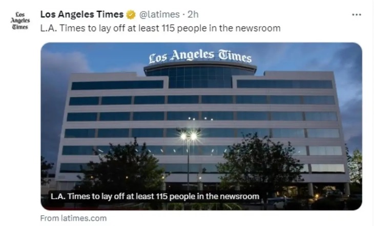 Лос Анџелес Тајмс денеска објави дека отпушта најмалку 115 луѓе, или повеќе од 20 проценти од редакцијата, што претставува едно од најголемите намалувања на работната сила во историјата на 142 години старата институција.