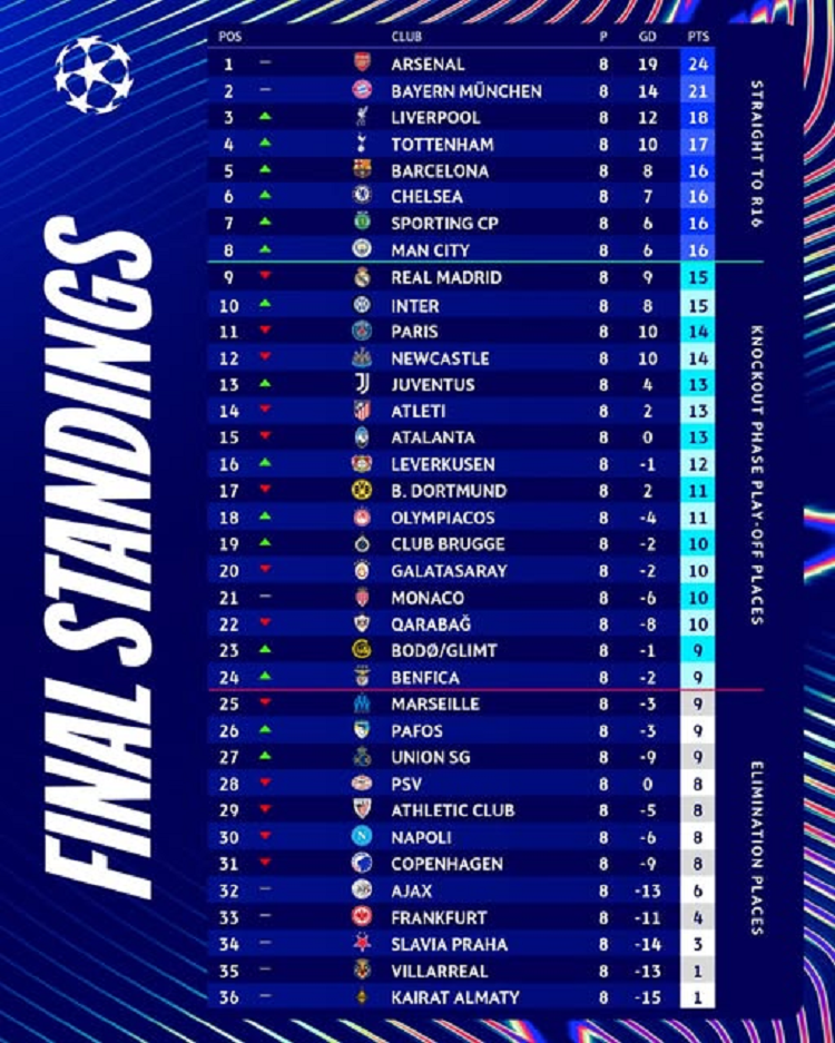 Во плеј-офот играат: Реал Мадрид, Интер, ПСЖ, Њукасл, Јувентус, Атлетико Мадрид, Аталанта, Баер Леверкузен, Борусија Дортмунд, Олимпијакос, Клуб Бриж, Галатасарај, Монако, Карабаг, Бодо/Глимт и Бенфика.