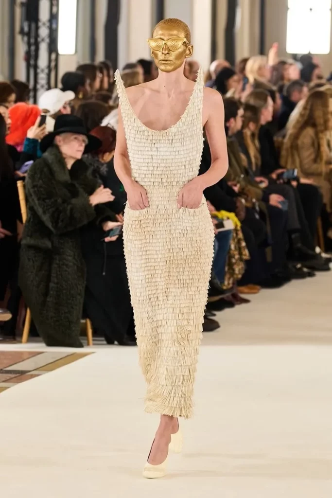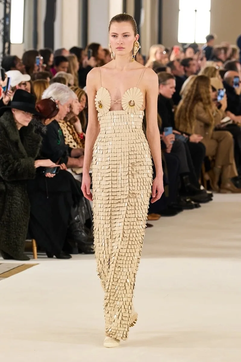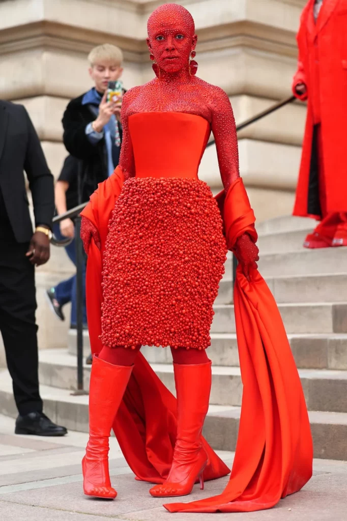Црвено-жешкиот изглед се издвојуваше меѓу толпата, но имаше и смисла. Изложената колекција на Скиапарели силно играше со референци за Божествената комедија на Данте и ги замати линиите помеѓу вистинското тело, уметноста и неживите предмети, откриваат информациите од шоуто.