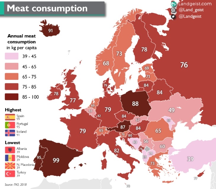 Шпанија е на прво место во Европа со 99 килограми месо по жител. Втора е Португалија со 95 килограми, а на трето место е Исланд со 91 килограм месо по жител.