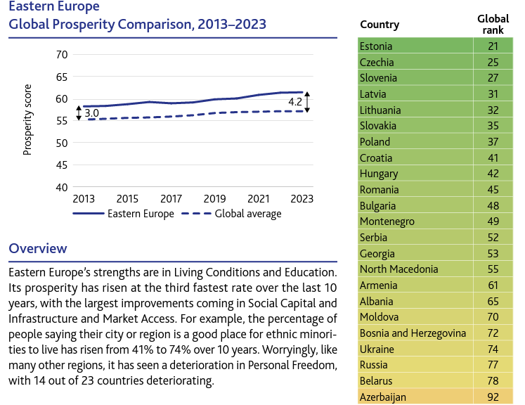 Македонија има најсилни резултати во инвестициската средина и условите за живеење, но е најслаба во природната средина. Најголемо подобрување во однос на пред една деценија има во социјалниот капитал, се вели во извештајот. Од 2011 година, Македонија се искачи на ранг-табелата за 3 места.