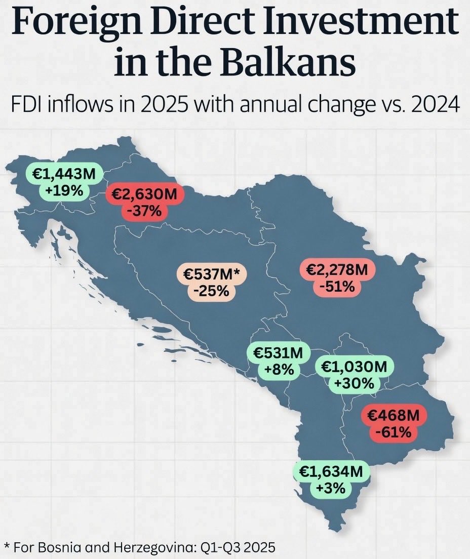 Според табелата за прилив на странски директни инвестиции на Балканот за 2025 година, споредена со 2024 година, Македонија покажала најлош резултат.