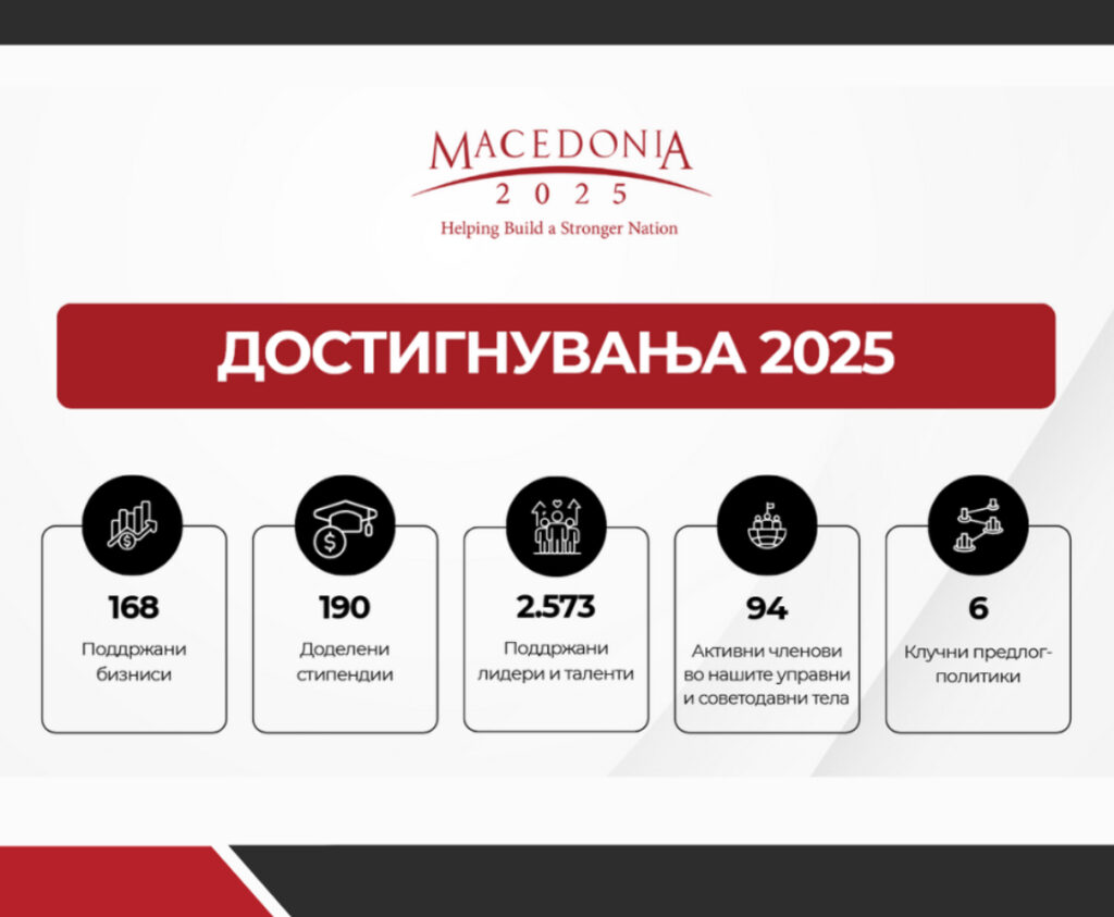 Македонија2025 ги објави резултатите од својата работа во 2025 година, при што организацијата постигна рекордни успеси во поддршката на економскиот развој, лидерството и глобалната поврзаност на земјата. Во 2025 година, Македонија2025 имплементирала, преку повеќе од 40 програми и иницијативи со кои се поддржани 168 компании, доделени се 190 стипендии за едукација и усовршување, а 2.573 лидери и таленти биле директно опфатени со програмите за развој. Организацијата исто така бележи значително зголемување на својот општествен импакт, со 94 активни членови во управните и советодавните тела и развиени шест клучни предлог-политики кои веќе се интегрираат во национални стратегии и реформски процеси.