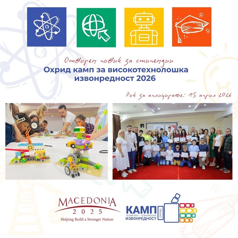 Македонија2025 информира дека е објавен Отворен повик за доделување на 20 стипендии за шестиот по ред Охрид Камп за високотехнолошка извонредност, кој ќе се одржи во периодот од 05 до 11 јули 2026 година во Охрид.