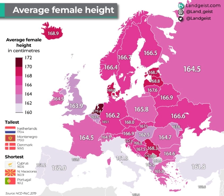 Жените во Северна Македонија се меѓу најниските во Европа, а мажите се близу до европскиот просек, покажува анализата на специјализираниот статистички сајт „Ландгеист“, базирана на податоци од NCD-RisC, мрежа на здравствени научници од целиот свет, која соработува со Светската здравствена организација.