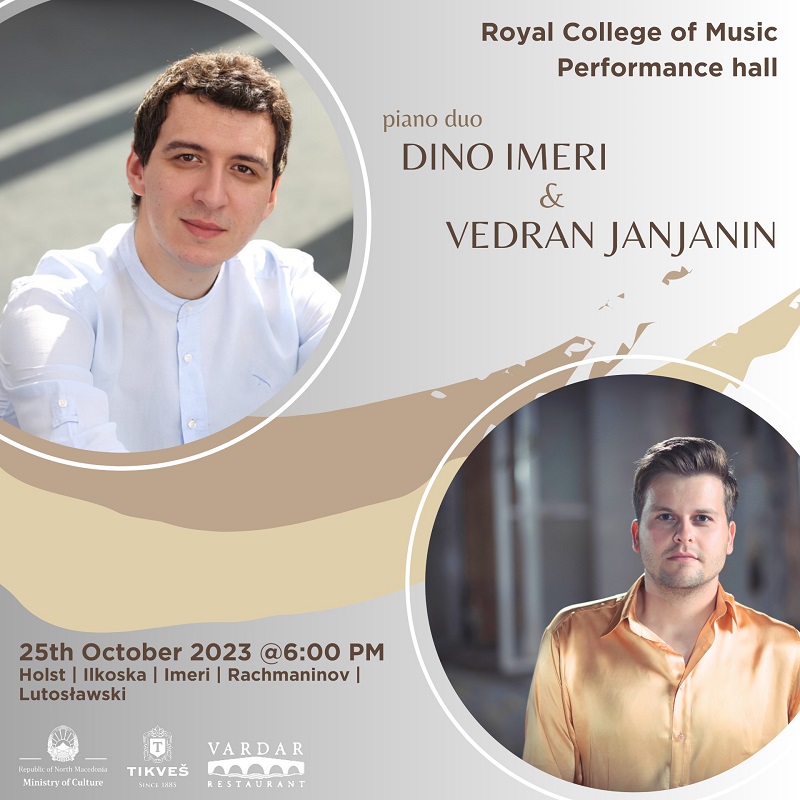 Дино Имери ќе настапи како солист на пијано, но и заедно со хрватскиот повеќенаградуван пијанист Ведран Јањанин. Ќе бидат изведени дела од Густав Холст („Јупитер“ од циклусот „Планети“), Сергеј Рахмањинов (Суита за две пијана бр.2), Витолд Лутославски („Варијации на тема од Паганини“ за две пијана), Дамир Имери („Пајдушко“ за пијано за 4 раце и „Себез Донка“), Дино Имери (обработка на „Јас те пратив на вода калино“) и Дијана Имери-Илкоска („Корени“).